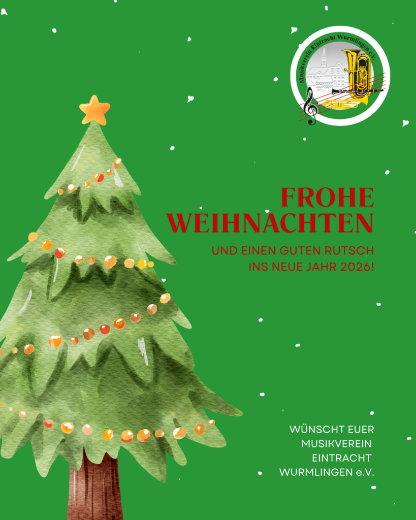 Der Musikverein Eintracht Wurmlingen e. V. wünscht allen ein besinnliches Weihnachtsfest und einen guten Start ins neue Jahr. Ein riesiges Dankeschön an alle, die uns 2025 begleitet und treu unterstützt haben. Wir freuen uns, wenn wir Euch alle 2026 bei unseren Konzerten und Auftritten wieder sehen und wir wieder gemeinsam die Freude der Musik genießen können. Wir verabschieden uns für dieses Jahr und freuen uns darauf, Euch im neuen Jahr wieder mit Neuigkeiten aus unserem Verein zu versorgen.